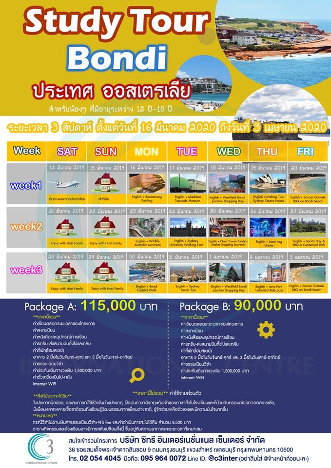 ขอเชิญชวนน้องๆที่มีอายุระหว่าง 12-18 ปี เข้าร่วมโครงการ Study Tour ที่ Bondi ประเทศออสเตรเลีย เป็นระยะเวลา 3 สัปดาห์ ตั้งแต่วันที่ 16 มีนาคม 2020 ถึง วันที่ 3 เมษายน 2020 โครงการนี้เป็นการเรียนภาษาอังกฤษพร้อมทำกิจกรรมต่างๆมากมาย